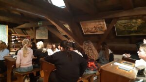 Um nicht nur den Künstler, sondern auch die Schule zu dieser Zeit etwas besser kennenzulernen, absolvierten wir eine „Schulstunde“ an historischen Schulbänken und lernten eine Menge über die Sütterlin-Schrift und das damalige Schulleben.