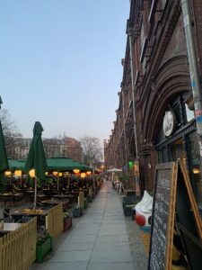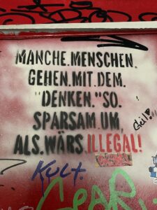 Abends trafen wir uns alle wieder am Hackescher Markt, zur Nachtführung durch Friedrichshain und Kreuzberg. Berliner Nachtlebenluft schnuppern. Street-Art im Hinterhof des Hauses Schwarzenberg erkunden, subkulturelle Szene am Ufer der Spree am RAW-Gelände auf sich wirken lassen – mit Skatehalle (leider waren die Skater nicht so freundlich wie erwartet), Boulderkomplex und einer Tele-Disco, gleichzeitig die Kontraste zu aufwändig sanierten Gebäuden und protzigen Geschäften wahrnehmen. Am Rückweg schlenderten wir entlang der East-Side-Gallery zum S-Bahnhof. Bei einem Großteil der Schülerinnen und Schüler zeigten sich die Ermüdungserscheinungen deutlich, sodass wir nicht mehr über die Oberbaumbrücke nach Kreuzberg gingen.
