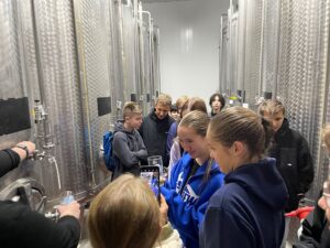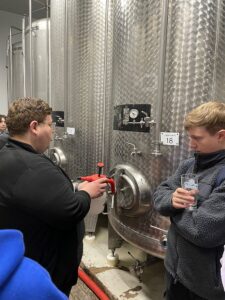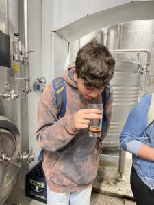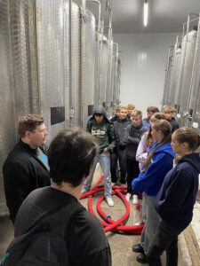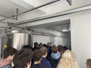 Der für den Biologieunterricht wichtige Gärprozess erfolgt in der nächsten Station. In großen 6000-Liter-Bottichen findet in der Meinel Bräu eine sogenannte ‚offene Gärung‘ statt. Dieser und weitere Fachbegriffe, wie ‚obergärig‘ und ‚untergärig‘, sowie die Bedeutung der langen und kühlen Lagerung der Biere im Felsenkeller wurden uns während der Führung näher gebracht. Besonders „anschaulich“ konnten die Schülerinnen und Schüler die Unterschiede verschiedener Biersorten erfahren. Hierzu füllte Herr Hermann verschieden herbe, süße, leichte und schwerere Biere als Geruchsproben ab, die von der Klasse fachmännisch beurteilt wurden.