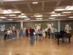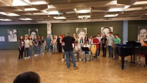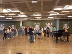 Neben dieser Preisverleihung wurde ein vielfältiges künstlerisch-musikalisches Programm angeboten. Nach der Begrüßung folgten sogleich Auftritte einzelner Chöre des JCRG, die mit Herrn Müller und Frau Walther unterschiedlichste Stücke geprobt hatten und diese zur Einstimmung in den Abend zum Besten gaben. Damit war der Auftakt mehr als geglückt! Im Rahmen dessen gab auch das Oberstufentheater unter Leitung von Frau Brendel ein bemerkenswertes selbstgeschriebenes Kurzstück, das die Aula in Staunen versetzte. Thematisch behandelte es das übergeordnete Thema „Rassismus“ in seinen Facetten wie Ausgrenzung und Diskriminierung.