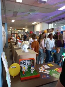 Es folgte sodann eine kurze Pause, die einem Gallery Walk von der Aula ins Foyer diente. Kernstück der Ausstellung stellte eine Plakatsammlung der Klasse 11a, passend zum ersten ART, dar, die durch die offizielle Anne-Frank-Gedenktagsausstellung des Anne Frank Zentrums Berlin ergänzt wurde. Kulinarisch sorgten die Spanischklassen des JCRG sowie die Q11 dabei für das eine oder andere Highlight und ein sorgfältig gestaltetes und äußerst schmackhaftes Buffet, das den Gallery Walk zusätzlich versüßte.
