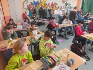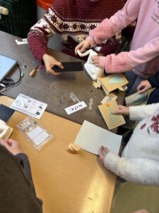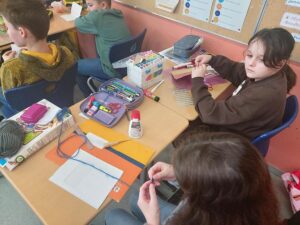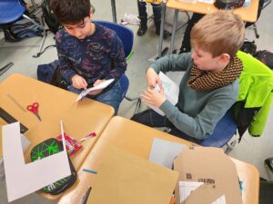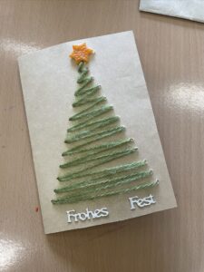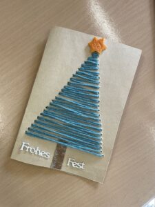 In diesem Jahr brachten die Schülerinnen und Schüler verschiedene alte Wollreste und Karton mit. Aus der Pappe wurden Karten ausgeschnitten, Löcher hineingestanzt und mit einer speziellen Fädeltechnik Wollreste durch die Löcher gezogen. Bald konnte man die Silhouette eines Weihnachtsbaums erkennen. Beim Verzieren der Karten konnten die Kinder ihrer Kreativität freien Lauf lassen: Sternchen oder weihnachtliche Botschaften ausstanzen, aufkleben oder die Karte anderweitig gestalten – es entstanden einzigartige Weihnachtsbaum-Motive, die die Freude an der Arbeit mit recycelten Materialien spürbar machten.