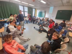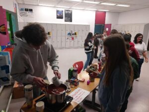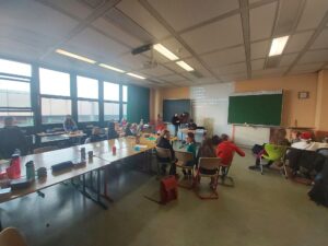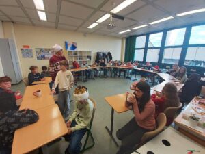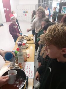 Ein weiteres Highlight erwartete die Klassen am Freitag direkt vor ihren Zimmern: Die Tutoren hatten einen stimmungsvollen Stand mit alkoholfreiem Punsch und weihnachtlichem Gebäck aufgebaut – eine kleine Stärkung für alle 5. Klassen. Außerdem sorgten sie mit selbst ausgewählten Geschichten und kleinen Spielen für Abwechslung und gute Laune. In gemütlicher Runde wurden kurze Weihnachtsgeschichten vorgelesen, und bei den Mitmachspielen konnten die Kinder gemeinsam lachen, rätseln und sich bewegen.