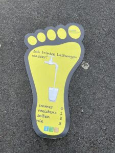 Nach der Rückkehr ans JCRG gab Frau Petri von den „Klimamachern 2.0“ den Schülern eine Einführung in den ökologischen Fußabdruck. Bei tollem Wetter alle im Atrium die Gelegenheit, ihren eigenen ökologischen Fußabdruck zu erstellen. Hier wurde erneut klar, dass man bereits durch das Trinken von Leitungswasser einen persönlichen Beitrag zum Umwelt- und Klimaschutz leisten kann.