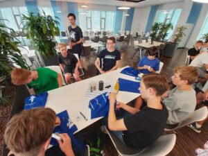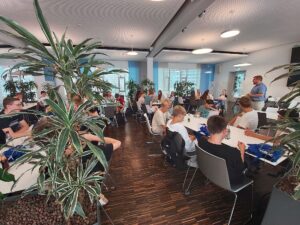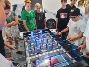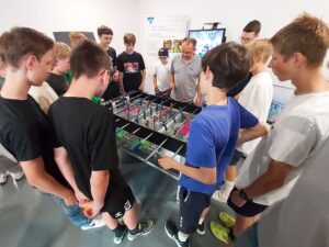 Wir durften bei einer Führung durch die moderne Lehrwerkstatt einen Blick hinter die Kulissen werfen und bekamen unter anderem einen Einblick in den 3D-Druck sowie die Ausbildungswerkstatt. Keramik ist der Grundstoff für jene Bauteile, die in Selb produziert werden: Widerstände und Kondensatoren. Rechnerisch befindet sich in jedem Smartphone weltweit mindestens ein Bauteil von Vishay. Ohne die, oft winzigen, Bauteile des Unternehmens würde kein Smartphone, kein PC und kein Auto funktionieren. Ein Highlight waren die mit dem 3D-Drucker hergestellten „Vishay-Würfel“ sowie der selbstgebaute, vollautomatische Kicker-Tisch, welcher natürlich sofort bespielt wurde. Bei einem Rundgang im Werk 3a konnten wir dann die einzelnen Produktionsschritte eines Kondensators, welcher zur Bekämpfung von Tumoren eingesetzt wird, live erleben.