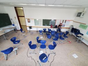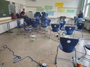 Danach war erst einmal Mittagspause, in der alle Teilnehmer zusammen in der Mensa Mittag aßen, bevor für einige schon gegen 12:40 Uhr die Exkursion zum Energiepark startete. Alle anderen konnten noch eine Viertelstunde länger die Mittagspause genießen und sich beispielsweise eine Ausstellung in der Turnhalle anschauen. Anschließend starteten auch die anderen Workshops, wobei über Experimente mit dem iPad bis zur Kryptologie, viele interessante Workshops zur Auswahl standen.