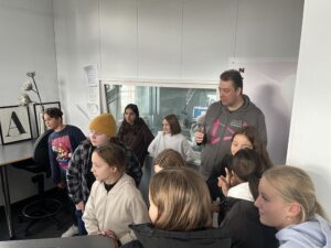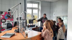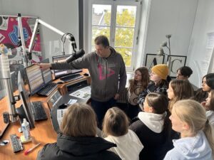 Aufgeteilt in zwei Gruppen hat uns Kai Losert von Radio Euroherz das Funkhaus gezeigt und viele spannende Informationen über den Radiosender und zum Beruf des Reporters gegeben. Ein paar Schülerinnen und Schüler durften ihn sogar direkt interviewen und ihre ersten Aufnahmeversuche starten.