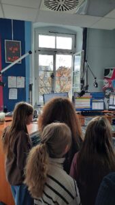 Am Montag, 06. 11.2023, fand der erste Kreativ-Tag der Klasse 6c/d statt. Im ersten Halbjahr tauchen wir ein in die Radio-Welt. Nach einem kurzen Kennenlernen und Vertraut-Machen mit den Aufnahmegeräten ging´s zu Fuß zum Funkhaus Hof, hier hat uns Frau Alkan begleitet.