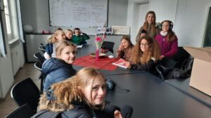 Die jeweils andere Gruppe, die nicht im Funkhaus war, war unterwegs in der Fußgängerzone. Dort haben je drei Teams ihre ersten eigenen Aufnahmen mit den Aufnahmegeräten gemacht, Geräusche aufgenommen, Umfragen gemacht. Bei unserem nächsten Treffen der Kreativ-Klasse 6c/d werden wir dann diese Aufnahmen schneiden und für eine eigene Präsentation vorbereiten.