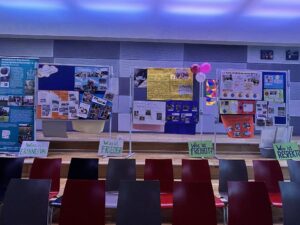 Jede Schule hatte die Möglichkeit, ein Plakat zu gestalten und ihre Projekte den anderen Teilnehmenden vorzustellen. Unser SOR-SMC-Team präsentierte dabei den Anti-Rassismus-Tag, die Gedenkgalerie zum Holocaust, sowie unseren neuen Paten Kristan von Waldenfels.