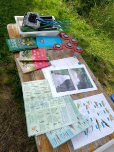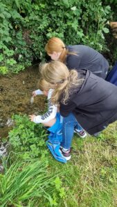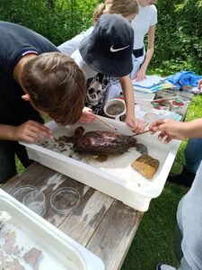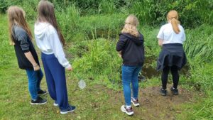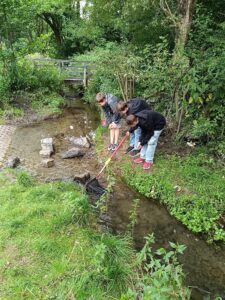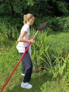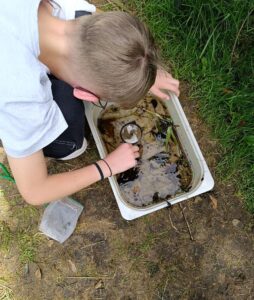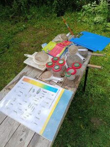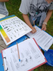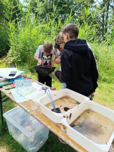 Gewässer als Lebensräume standen ebenfalls im Fokus der Exkursion. Hier lautete die Devise: Lernen mit „Herz und Hand“. Ausgerüstet mit Keschern, Gefäßen, Lupen und altersgerechten Bestimmungshilfen ging es also raus in die Natur, wo die Schülerinnen und Schüler in verschiedenen Gewässertypen die Tierwelt erkunden konnten. Bei Sonnenschein und angenehmen, sommerlichen Temperaturen wurden mit Begeisterung zahlreiche Wirbellose, wie Wasserwanzen, Schwimmkäfer, Fliegenlarven und Wasserschnecken in Tümpel und Bach gesammelt und mit Hilfe von bebilderten Karten und Büchern identifiziert. Am Bach konnten die Kinder ihre Funde zudem nutzen, um die Gewässerqualität zu bestimmen.